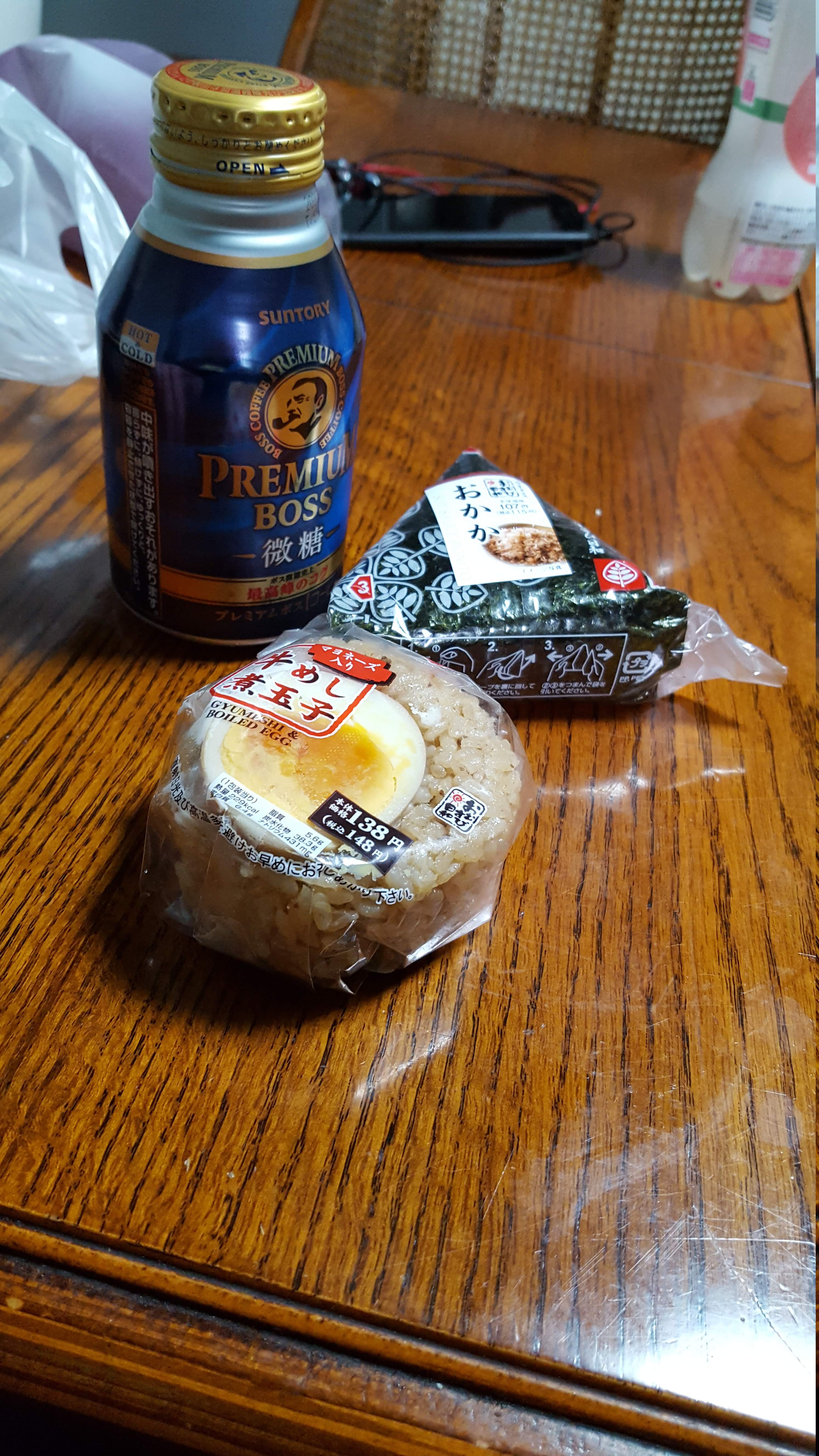Nach einem guten Schlaf im Futon auf Tatamimatten, ging es auf die Jagd nach Frühstück. Seit unserem letzten Besuch im Juyoh Hotel wurde direkt daneben ein Kombini (Convenience Store; oder für die Ostdeutschen Leser: Konsum ;) ) errichtet. Somit endete unsere Jagd in Selbem. Für den Autor gab’s ein traditionelles Onigiri mit Thunfischfüllung und ein mit Rinderbrühe gewürztes Reisbällchen mit Ei. Unser Editor-in-Chief genehmigte sich ein Instant-Yakisoba. Nicht fehlen durfte natürlich der BOSS (Kaffeedose).